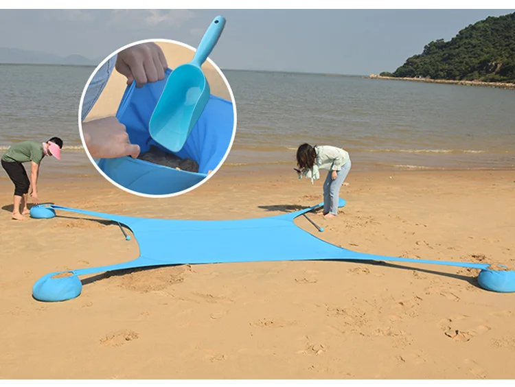 1. Firstly, fully unfold the canopy and lay it flat on the beach, with the four corners of the canopy naturally extending. Fill the sandbags with enough sand using the delivered sand shovel.