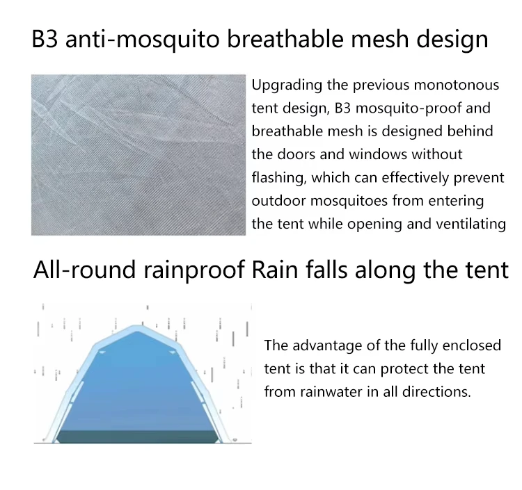 2. Mosquito repellent mesh net design, breathable, perfect for summer camping. 3. The door can be proped up by poles as a sunshade cover. (The poles are not included.) 4. Anti-UV and waterproof protection Camping tent Cloth. |