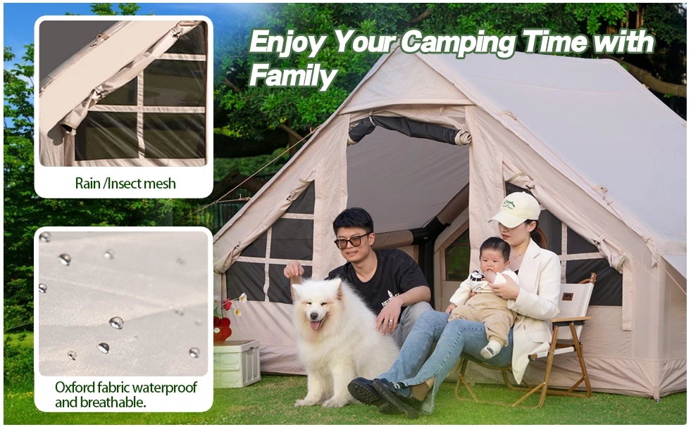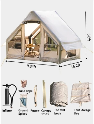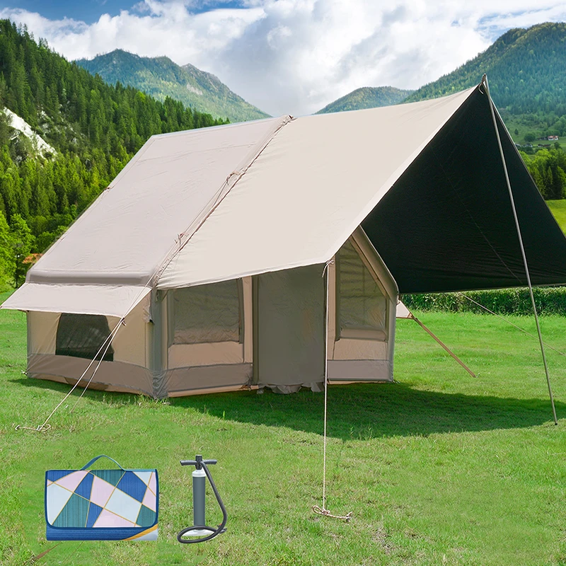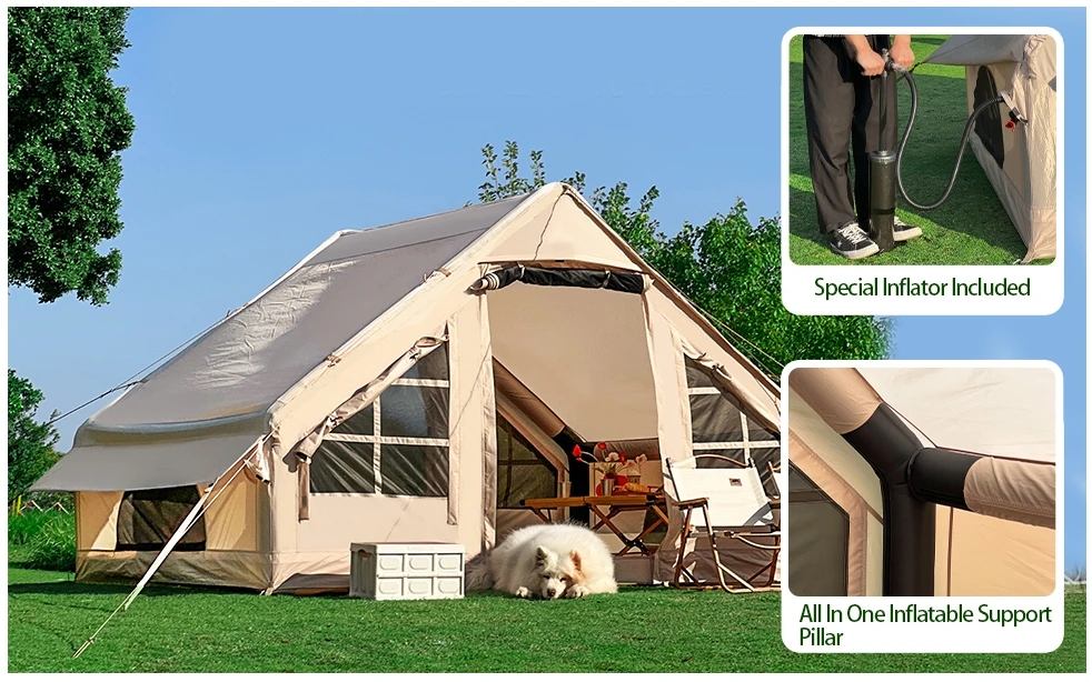 Inflatable camping tents replace traditional poles with air beams for support. These air beams are inflated using manual or electric pumps, allowing faster setup, better flexibility, and enhanced stability compared to conventional tents.